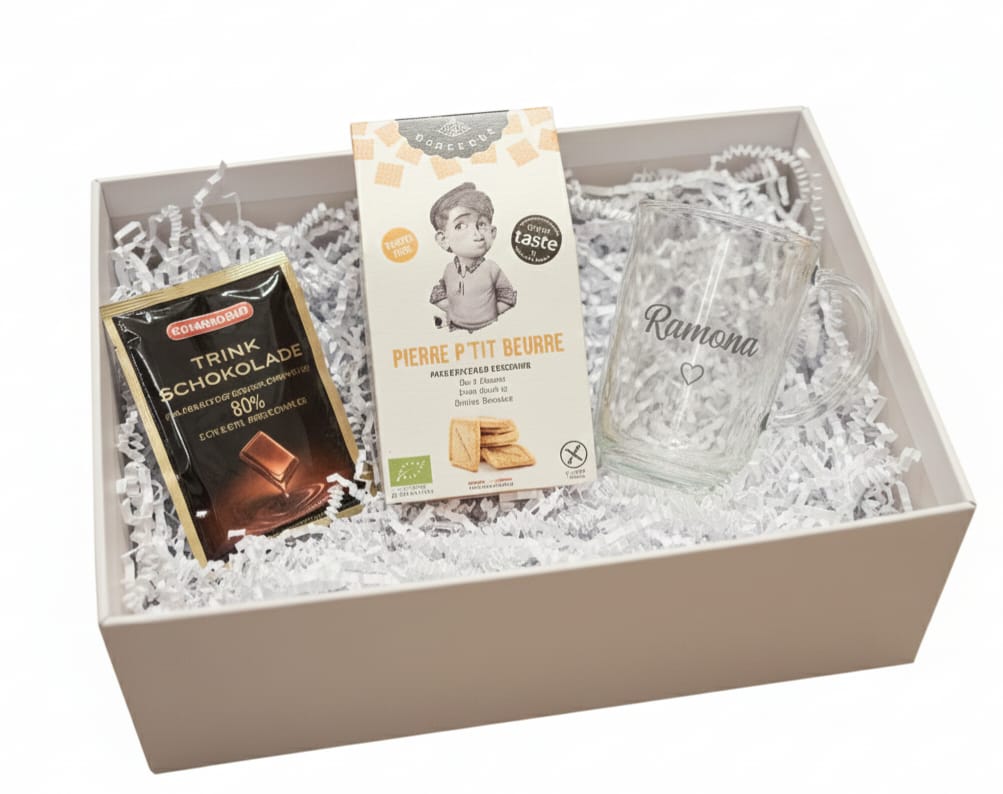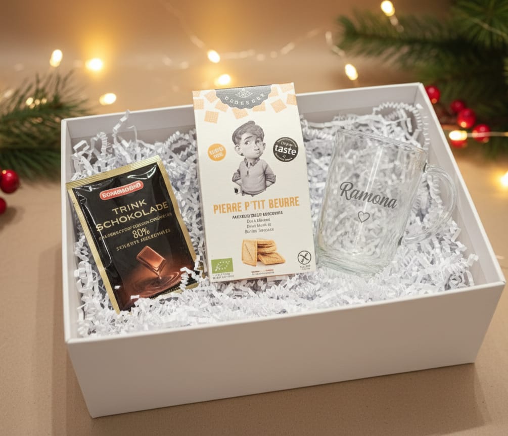 Diese liebevoll zusammengestellte Geschenkbox steht für kleine Auszeiten und genussvolle Momente. Eine harmonische Kombination aus Süßem, Warmem und Persönlichem – ideal als Weihnachtsgeschenk, Aufmerksamkeit für besondere Menschen oder kleine Geste mit großer Wirkung. Im Mittelpunkt steht eine personalisierte Glas-Tasse, individuell graviert mit Namen oder Wunschtext. Ergänzt wird sie durch hochwertige Trinkschokolade sowie feines Buttergebäck – stilvoll arrangiert in einer eleganten Geschenkbox.