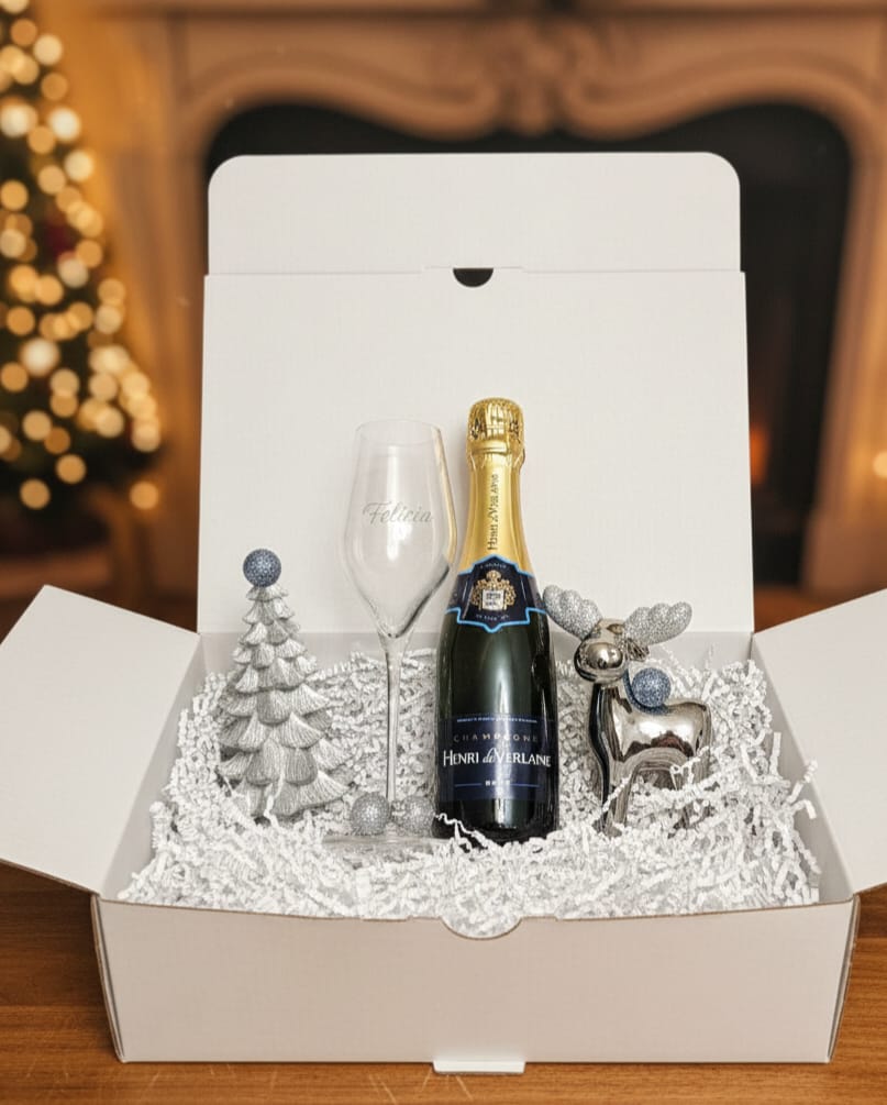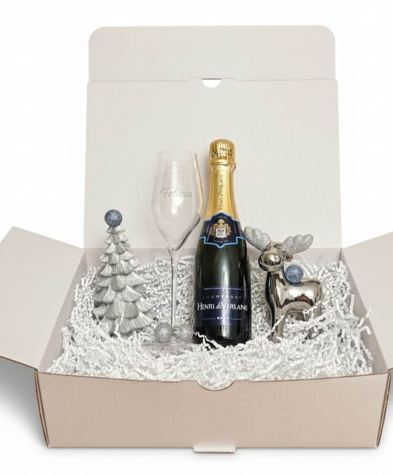 Ein Geschenk, das strahlt wie eine winterliche Schneelandschaft – edel, festlich und persönlich. Unser „Silberner Winterglanz“ Geschenkset vereint stilvollen Genuss mit zeitloser Eleganz. Perfekt für alle, die das Besondere lieben und die Festtage mit einem Hauch von Glamour feiern möchten. Der feine Champagner „Henri de Verlaine“ lädt dazu ein, auf unvergessliche Momente anzustoßen. Umrahmt wird er von einer wunderschönen Winter-Szenerie: Ein funkelnder silberner Deko-Tannenbaum und ein elegantes Rentier in Chrom-Optik sorgen sofort für festliche Stimmung und bleiben als stilvolle Dekoration lange erhalten.